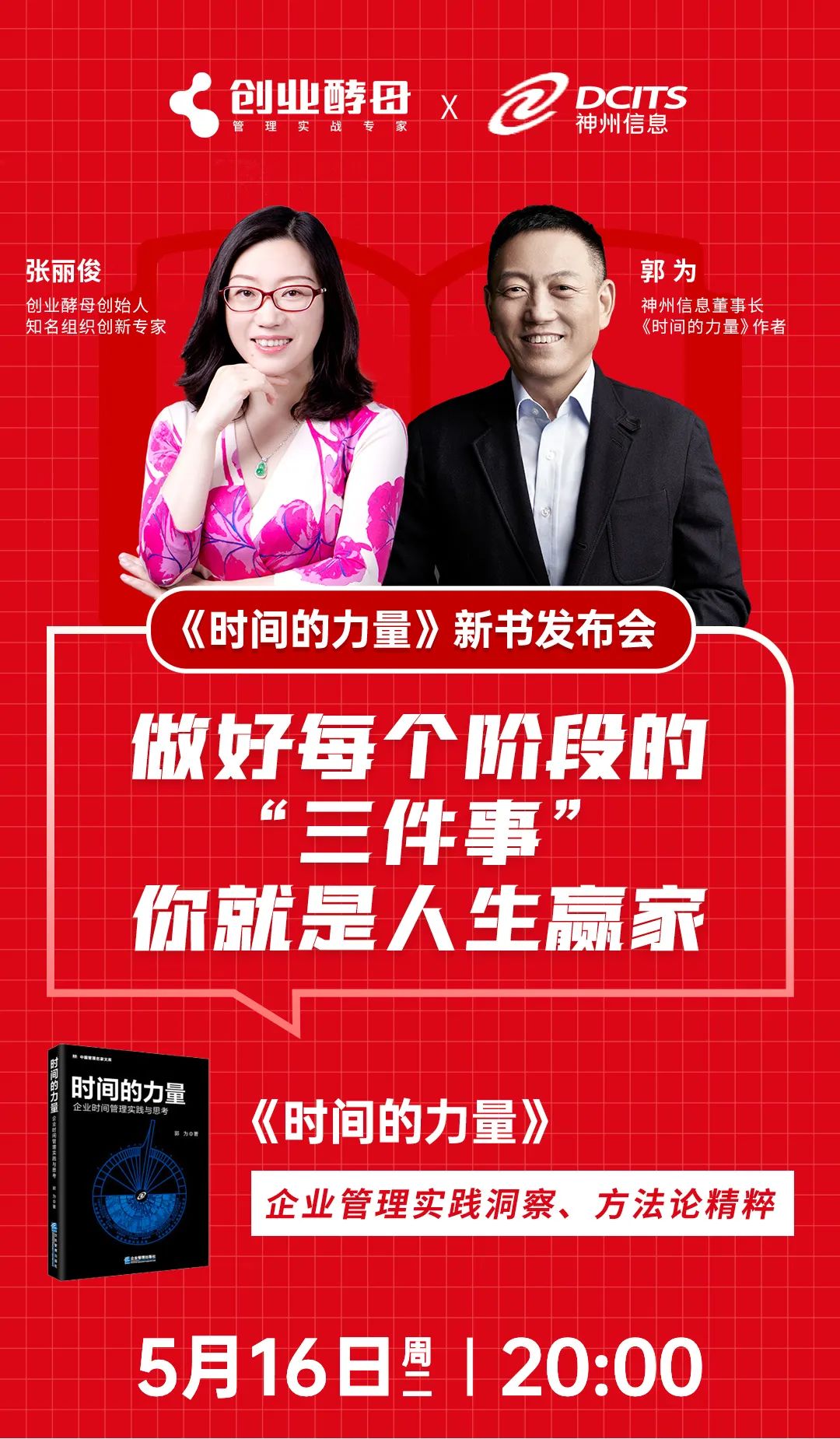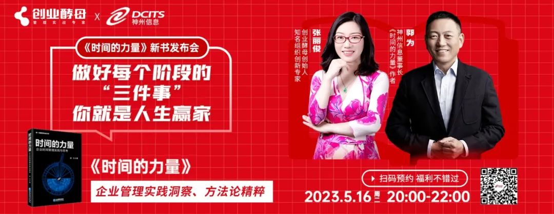 5月16日20:00郭为将携新书《时间的力量》做客创业酵母创始人、知名组织创新专家张丽俊的直播间,共同探讨时间管理,为读者揭开生产力、效率、利益时间之间的奥秘。